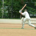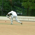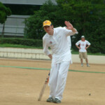 A new dawn emerged for the Wombats batting as a new opening pairing of Burkey and the debutant Bjorn strode out to run down the meagre total. A good start from the boys and Bjorn who’s first ball for the Wommies was a glorious straight drive back down the pitch which scorched the field like a tracer bullet on it’s way to the goalposts. However Japanese cricket pitches had the last laugh as Bjorn learn the harsh lesson (that we’ve all learned) and went to pull a short-pitched stinger, which innocuously shot below knee height onto the stumps. Burkey and Chuck together is always a safe combination and after seeing off the demons in the pitch being cast out by Dave and Sameer, to be 1-30 after about 10 overs drinks, but the boys then turned it on and smashed the remaining 108 runs off the next 16 overs. Burkey once again proved what a force in Japan cricket he is smashing some staggering shots in the rain (one massive straight hit and a cut shot over the point boundary just to name a few) and finished with 69 from about as many balls. The Skip ably supported and was unlucky not to post his half-century and remained not out on 43 to see the wombats comfortably home at 1-139 off in the 26th over.