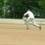 A lot of tired boys stumbled onto the field as dry as Ghandi’s sandal, and the lackadaisical catching practice said it all. Anyhow Pup and this editor were handed the new ball. After 3 steadying overs to sober up a bit and both of us getting smacked (Russ launching the first of this editor’s third over into the Kobe skyline) it looked like KRAC were going to make a fist of it. However we finally had the break through when Thompy spooned a mistimed pull to Scottie at square leg. Three balls later Robb Mckenna nervously prodded outside off to give the Dinosaur a simple take behind the stumps, although it did require McKenna to show the umpire that he had in fact hit it by walking. This was very sporting of Robb, but proved equally disastrous for KRAC, because next over Pup steamed in and ripped one past the hapless Dave for a first baller (well catch by the Doc at first slip) and KRAC were in deep shitski at 3-20 odd.