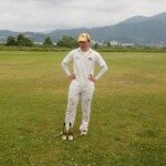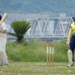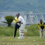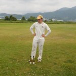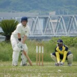 In came Dino and after swapping singles with Patmore decided to go for a swipe, skied one and was caught at mid-off. His length of innings was double that of Ev’s (2 balls!) but he was there long enough to pull his calf and hobble off to the boundary swearing to himself and worrying about what Etsuko might say if he needed a wheelchair to catch his flight to Korea the next day!