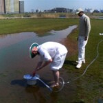 We had a fair bit of rain during the week, so we were expecting a few damp areas, and maybe a little bit of mud. What we had not expected was Ian Thorpe practising his starts, and nine species of fish swimming on the pitch.