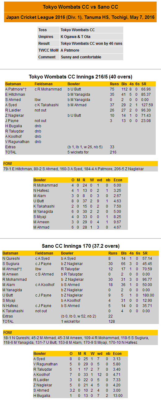 Yanagida’s tight bowling slowed the run rate in the middle overs, but Aamir “Sohail” Syed steadied the ship with a good partnership seeing us head towards 150 and setting up the chance for a big last 10 overs. Aamir went after a quickly compiled 37 to a super catch from the 15 year old high school Sano fielder on the boundary with an absolute ripper – with skipper Patmore going for an impressive 75 – cashing in after backing himself once again to score between 50-99. The scourge of spread betting raises its ugly head even in Japan?! The youngster in the Wombats side – Richard “my shoulder’s fine, it’s the hip replacement I’m worried about” Laidler saw the side past 200 with a fine late innings knock of 26 at run-a-ball with his first knock for the Wombats in many a year and showing the younger Wombats (for some who he is at least double their age!) exactly how it is done. Zeeshan “Zorro” Naglekar and Jamie “Bernie” Payne finished with a few runs swinging late on, and we ended up 5/216 off our allotted 40 overs. Not a bad effort, and 3 innings in a row with scores of over 200 is nothing to sneeze at, but we couldn’t help but feeling there were runs left out there.